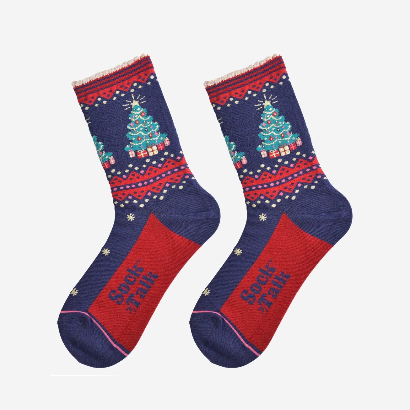 Breng de feestdagen tot leven met deze marineblauwe bamboesokken voor dames met een klassieke kerstboomprint en rode details.Warm, zacht en... Lees meer