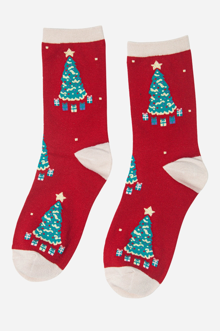 Bamboesokken voor dames – rood Christmas Tree (maat 36–40)